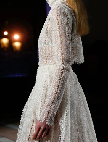 Stylist of this concept spent great effort certainly, left a flower, right a leaf, bottom cloth was united in wedlock snow gauze, mesh and all sorts of special design that differ from convention, confluent the heavy industry water dissolves embroider product of this group of stereo and nobility. There is no need for color, but the pure white looks fresh and transparent against the overlapping rhythm. Through the holes of different shapes on the surface of the lace, the sunlight reflects a wonderful image like the silhouette of the virtual and the real.